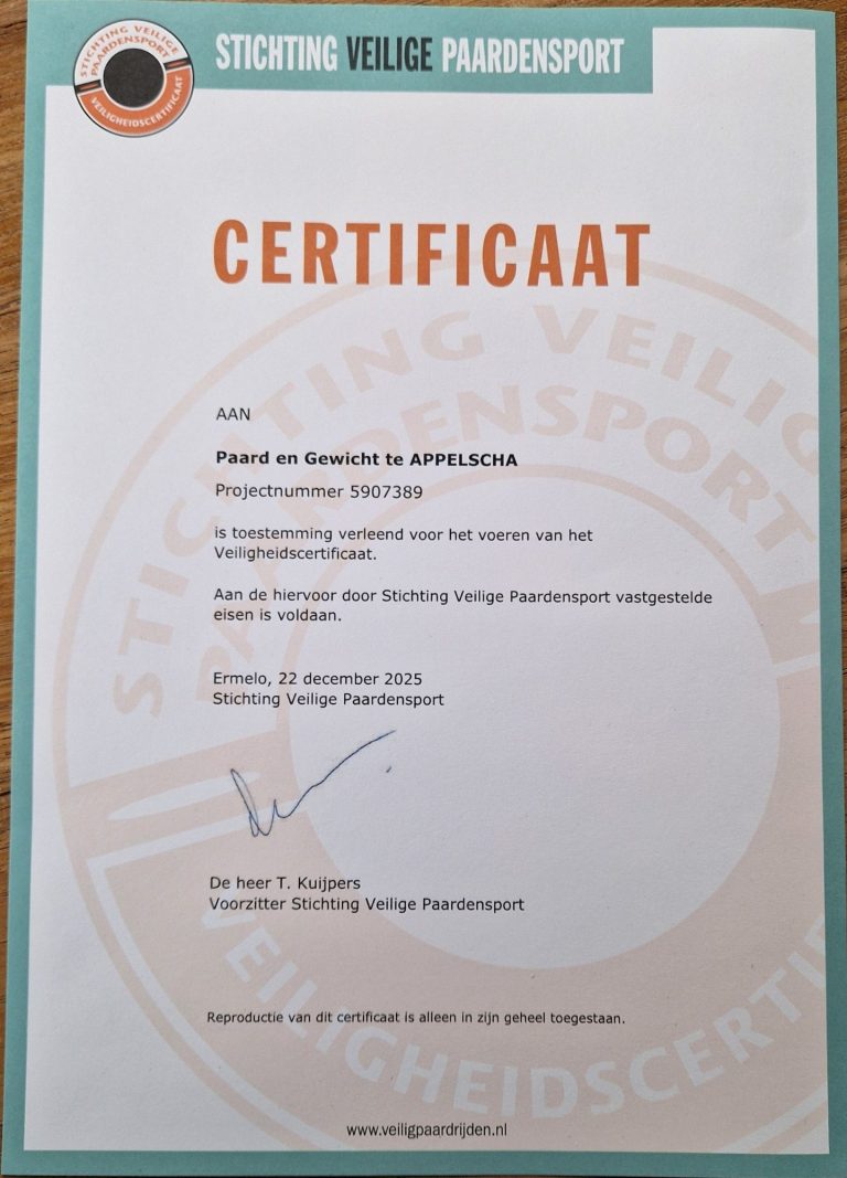 Paard en Gewicht beschikt over het veiligheidscertificaat, dit houdt in dat de accommodaties voldoen aan de eisen van Stichting Veilige Paardensport en goedgekeurd is door een inspecteur van de Stichting Veilige Paardensport.